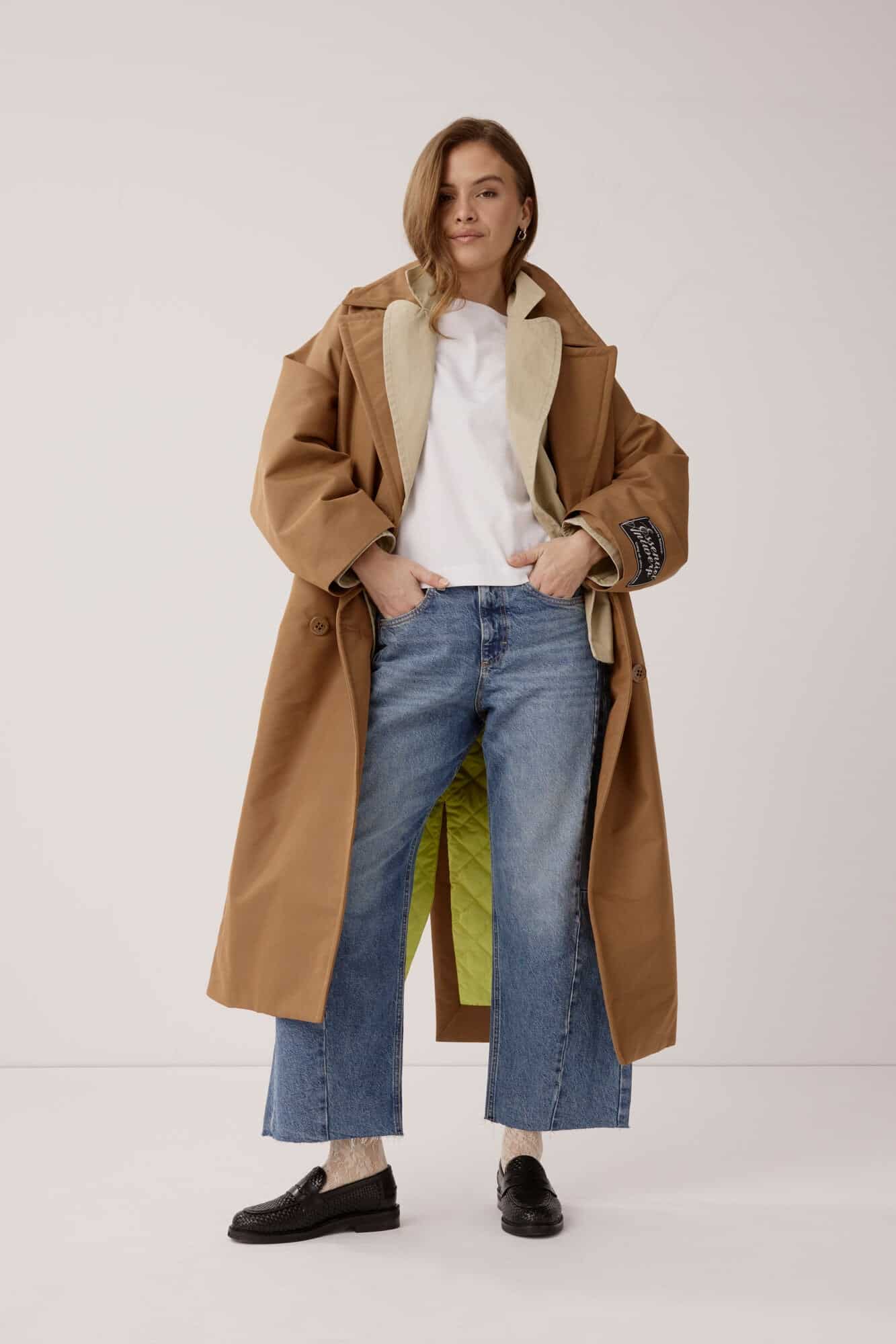 Denne dobbeltradede trenchcoat er designet med en oversized pasform, der giver et moderne og afslappet udtryk. De dropped shoulders understreger silhuetten, mens skrå lommer og en slids bagpå bidrager til både funktionalitet og bevægelsesfrihed. Frakken e