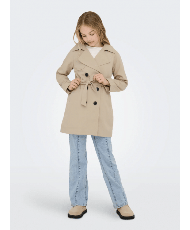 Giv din pige et klassisk og stilfuldt look med denne beige trenchcoat fra KIDS ONLY i farven Tannin. Jakken kombinerer tidløst design med moderne detaljer og er perfekt til både hverdag og særlige lejligheder. Det vævede materiale giver et elegant og stru