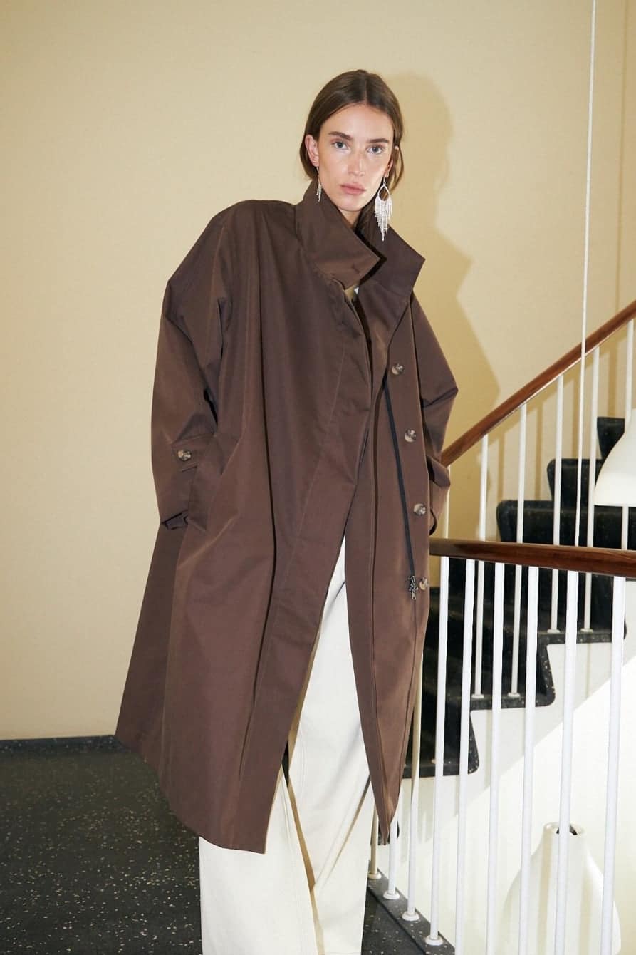 Denne trenchcoat fra Lollys Laundry er designet i en ensfarvet, mørkebrun nuance med lige og rummelig pasform. Modellen er knælang og har en asymmetrisk lukning foran, kombineret med både knapper og lynlås. Jakken er designet med en høj krave, der kan luk