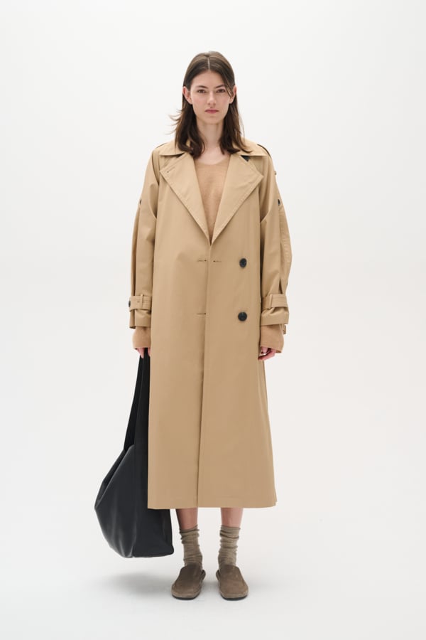 Lang trenchcoat med brede manchetter og store sorte knapper. Frakken har en klassisk lukning, bindebånd i taljen, bred krave og justerbare stropper på ærmerne. Pasform Pasform: Loose fitÆrmer: Langt ærme